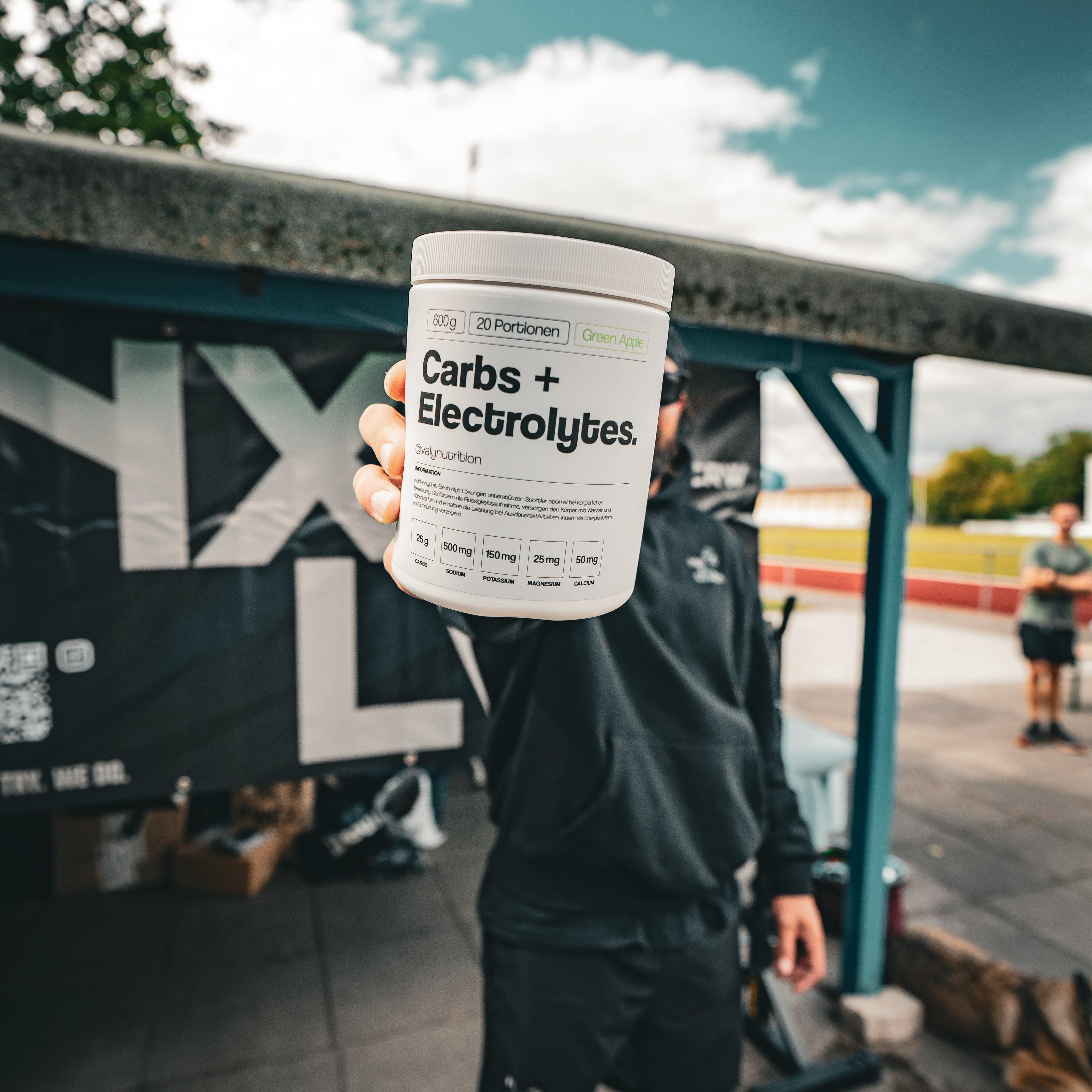 Kohlenhydrate versorgen die Muskulatur mit Energie, Elektrolyte unterstützen Flüssigkeitsaufnahme, Nervenleitung und Muskelfunktion. Ideal bei Hitze, Intervallen, langen Einheiten oder Wettkämpfen.