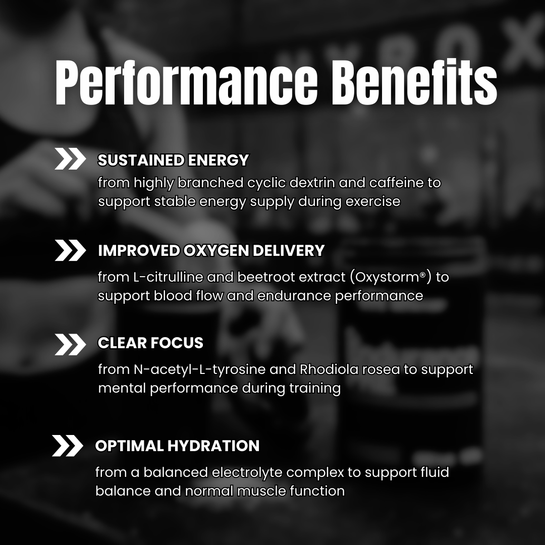 Carbs liefern Energie, Elektrolyte unterstützen die Flüssigkeitsaufnahme und Koffein verbessert den Fokus. Nitrate aus Oxystorm® und Roter Bete fördern die Durchblutung und Sauerstoffverfügbarkeit in der Muskulatur – für stabile Leistung bei hoher Intensität.