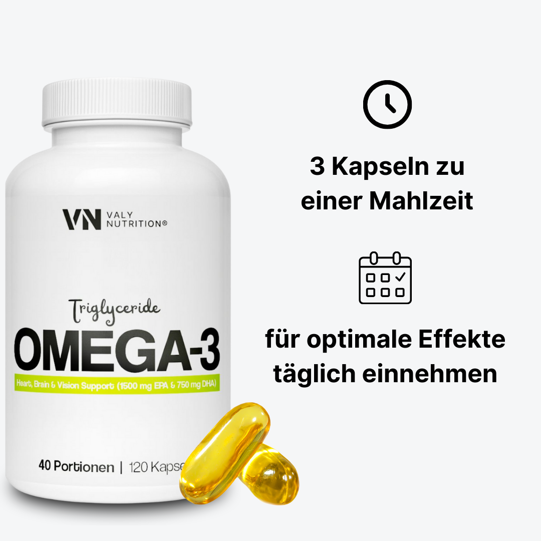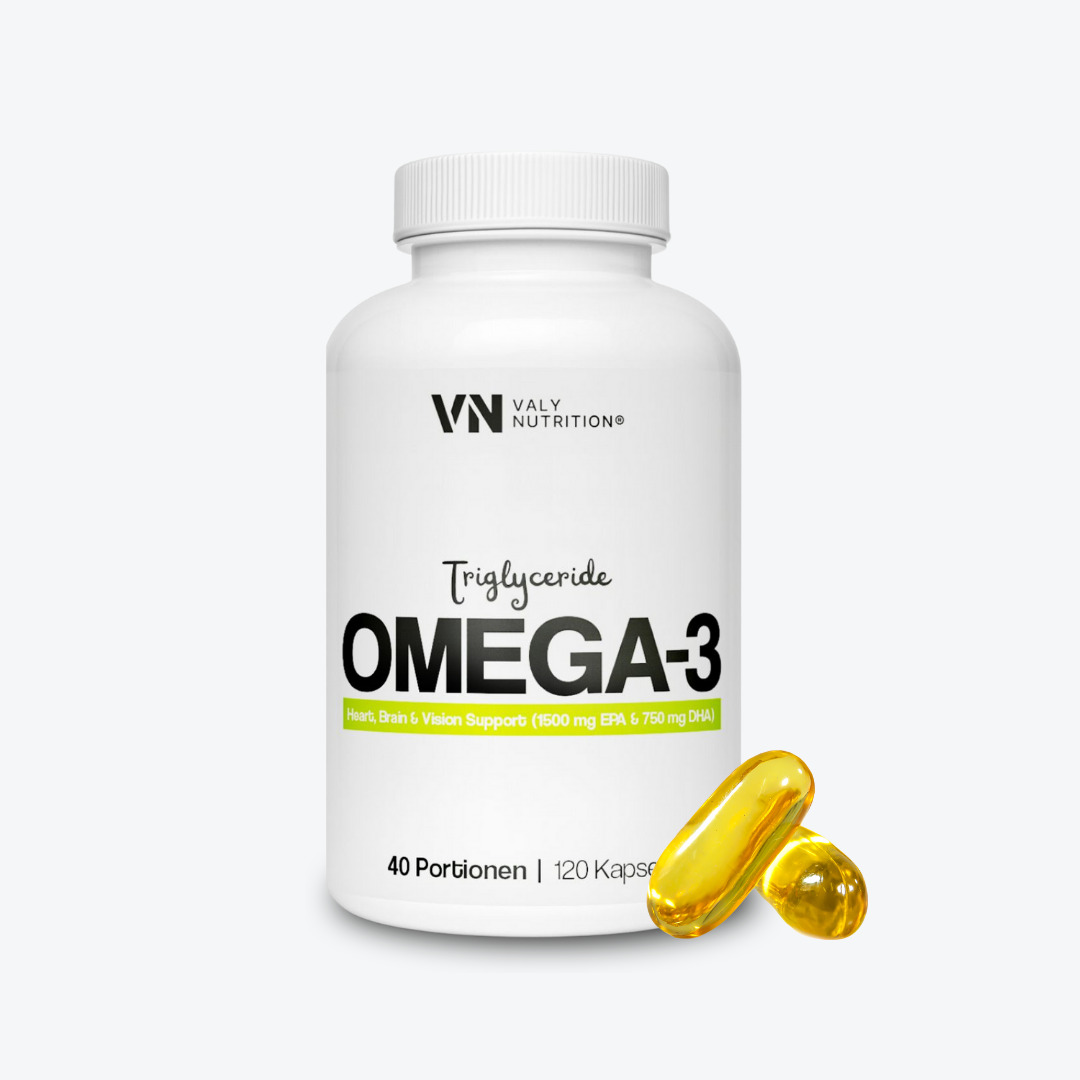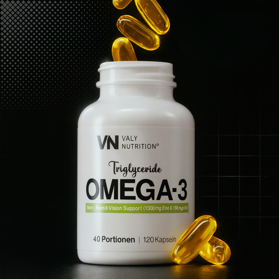 Valy Omega-3 liefert hochdosierte EPA- und DHA-Fettsäuren in natürlicher Triglycerid-Form - für Herz, Gehirn und Leistungsfähigkeit. Entwickelt für Sportler und aktive Menschen, die auf eine evidenzbasierte Versorgung mit essenziellen Fettsäuren setzen.