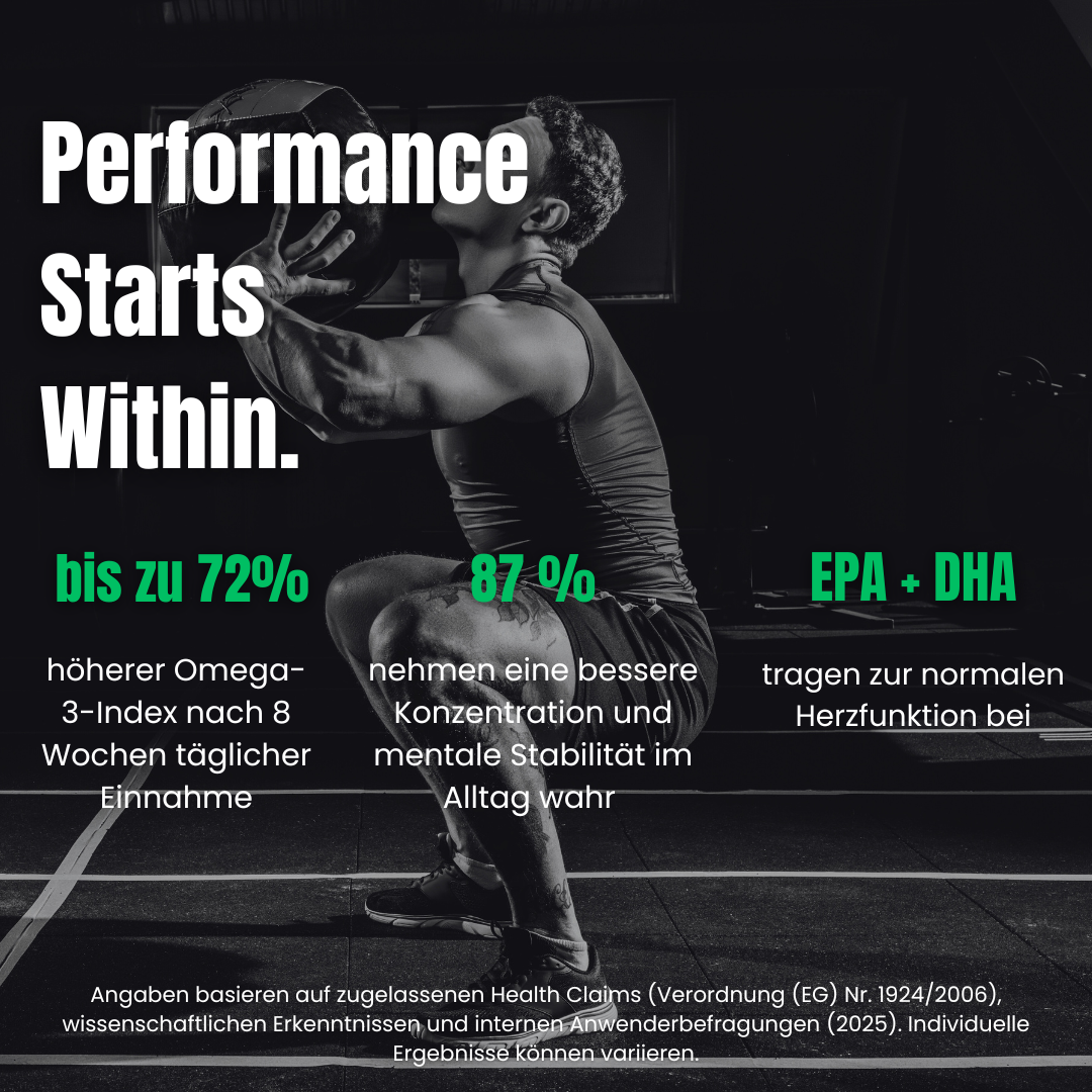 EPA und DHA sind essenzielle Fettsäuren, die u. a. zur normalen Herzfunktion beitragen. DHA unterstützt zusätzlich die normale Gehirnfunktion. Im Sportkontext werden Omega-3-Fettsäuren häufig eingesetzt, wenn Regeneration, Belastungsverarbeitung und langfristige Gesundheit im Fokus stehen.