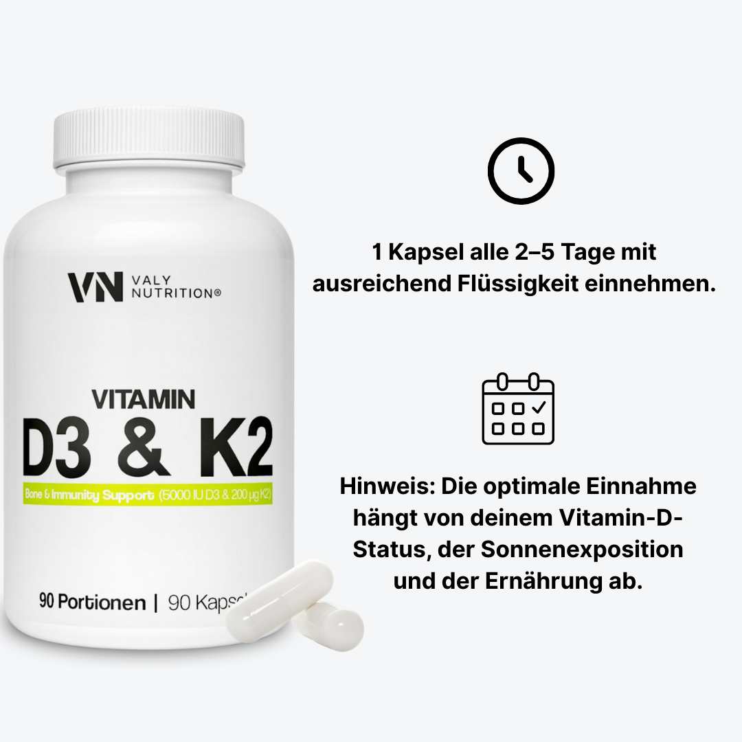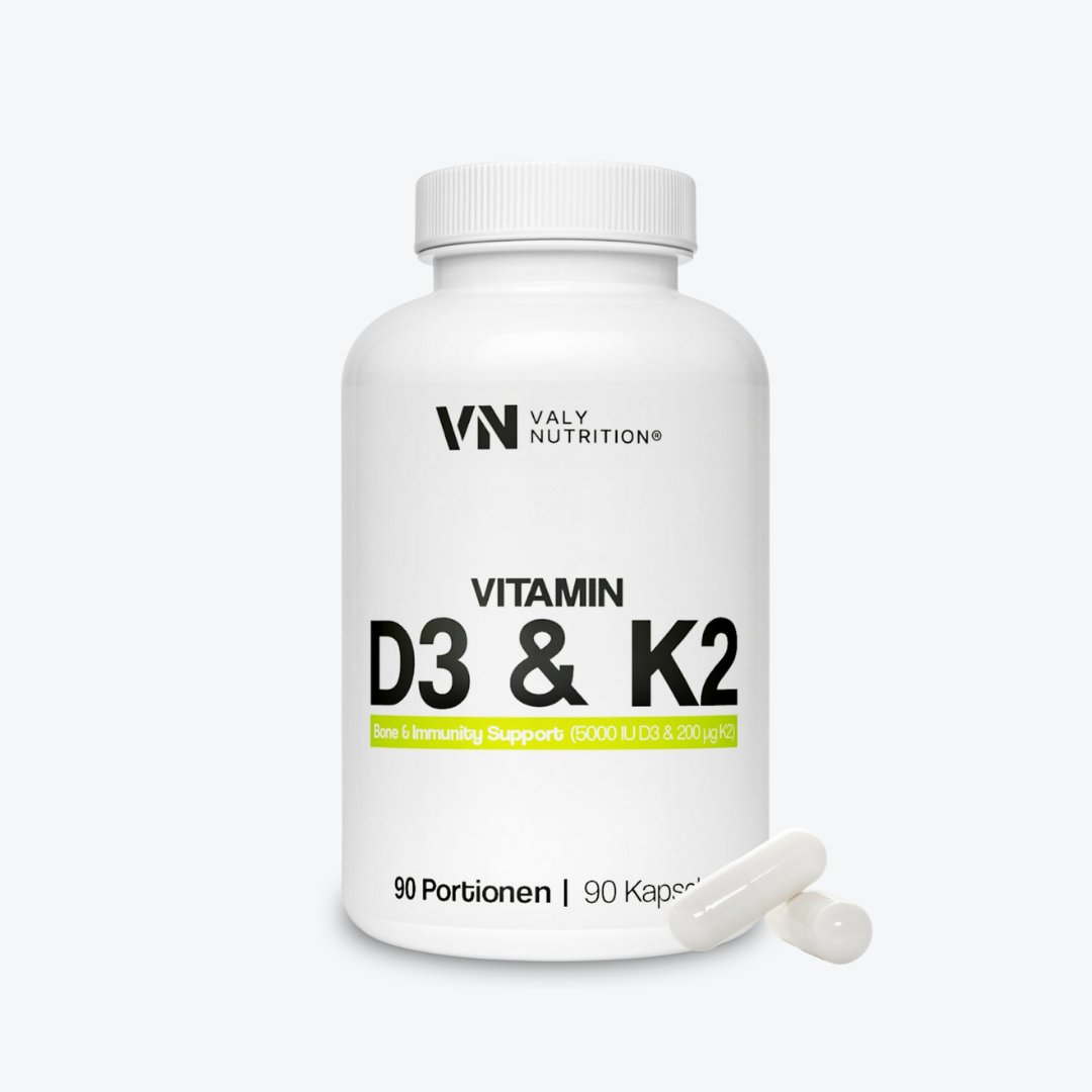 Valy D3/K2 kombiniert hochdosiertes Vitamin D3 mit fermentativ hergestelltem Vitamin K2 (VitaMK7®) - für die gezielte Unterstützung von Knochen, Muskeln und Immunsystem. Optimal abgestimmt auf die Bedürfnisse ambitionierter Sportler.